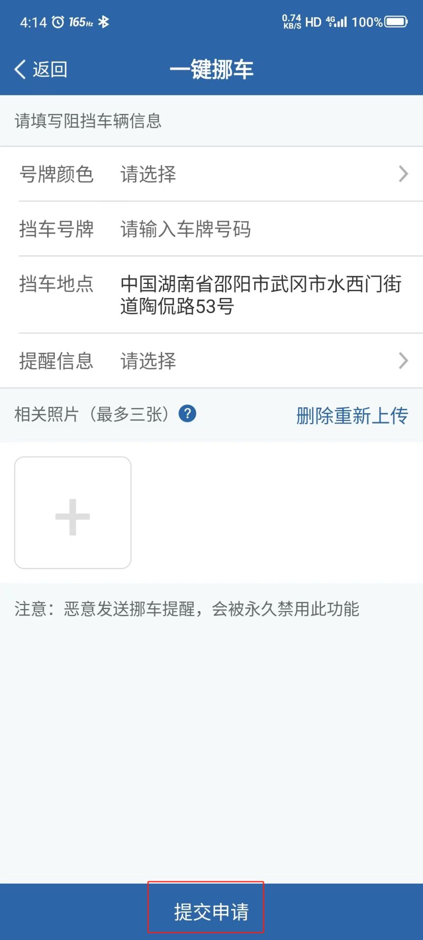 4、确认信息,提交挪车申请。系统会以手机短信、app消息推送等方式给车辆所有人发出挪车通知。如果挪车通知发送10分钟后仍未挪车,车辆被阻挡的车主可点击“催单提醒”,系统将再次通知阻挡车辆的车主前来挪车。