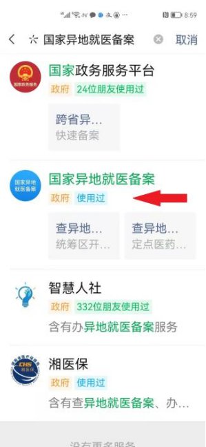 第一步:在微信内搜索小程序“国家异地就医备案”,进入小程序。(除了国家统一的国家异地就医备案小程序外,还可以选择电话(传真)备案、湘医保app以及直接到参保地的医保经办机构窗口办理备案)。