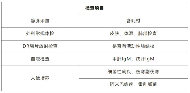 常规内外科体格检查(传染性皮肤病)、排除丙肝、戊肝病毒性肝炎)、大便培养(痢疾、伤寒杆菌、霍乱)、胸部透视(排除活动性肺结核)等。