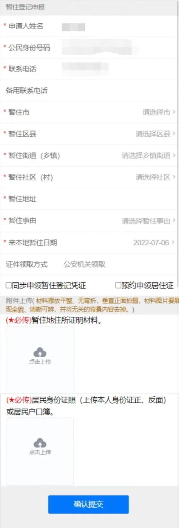 (2)需要申报暂住登记的,进入“暂住登记申报”模块,依照页面提示填写有关信息、拍照上传证明材料,提交办件申请(如下图)。