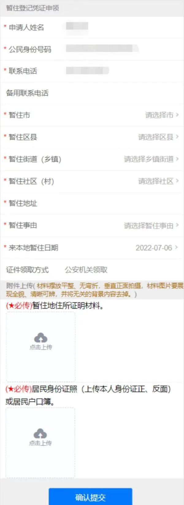(3)需要申领暂住登记凭证的,进入“暂住登记凭证申领”模块,依照页面提示填写有关信息、拍照上传证明材料,提交办件申请(如下图)。
