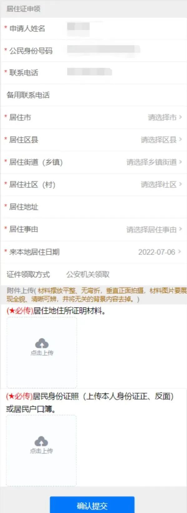(4)需要申领居住证的,进入“居住证申领”模块,依照页面提示填写有关信息、拍照上传证明材料,提交办件申请(如下图)。