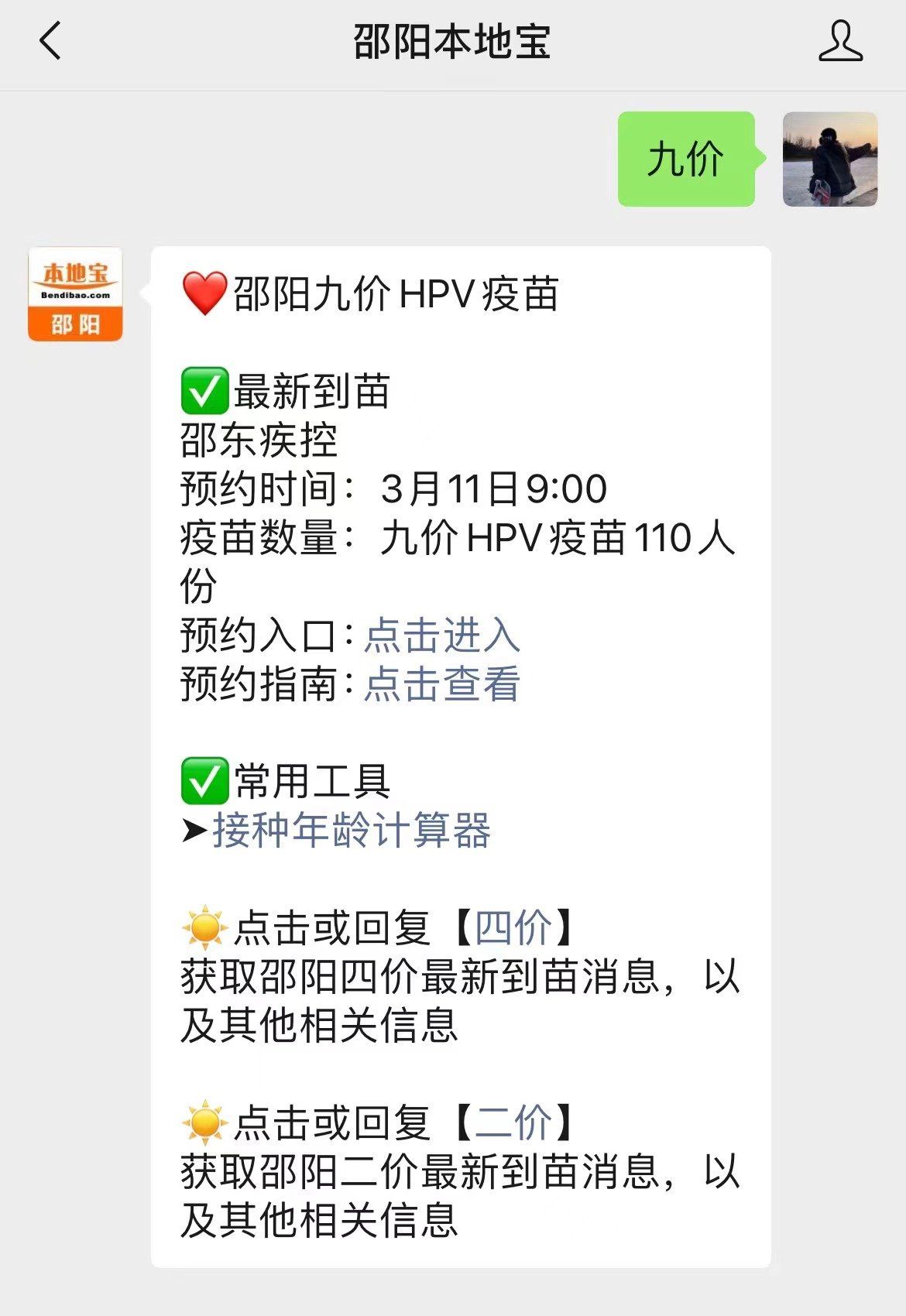 温馨提示:微信搜索公众号邵阳本地宝,关注后在对话框回复【九价】可获取最新hpv疫苗预约入口、预约指南,常用工具及疫苗知识等相关信息。