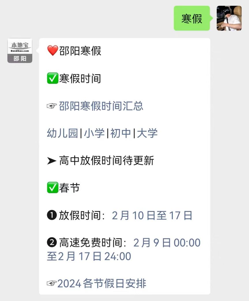 温馨提示:微信搜索公众号【邵阳本地宝】,关注后在对话框回复【寒假】可获取2023邵阳幼儿园/小学/初中/高中/邵阳学院寒假时间、春节时间、放假安排、2024节假日安排要求。